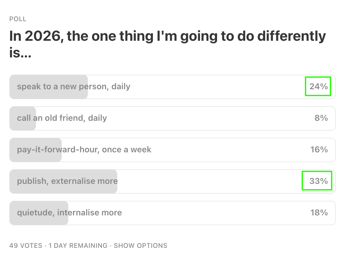 I encourage everyone I speak to, to do the same - just externalise more - and so was highly encouraged by the poll results last week. So, am thinking - is there a way I can help get everyone moving? Poll for this week folks, let me know whether you want it…